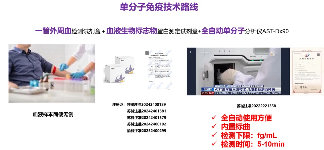 目前,宇測生物基于完全自主知識產(chǎn)權(quán)的領(lǐng)先單分子免疫檢測技術(shù),檢測靈敏度可達(dá) fg/mL 量級,能夠準(zhǔn)確檢測出血液中濃度極低的p-tau生物標(biāo)志物的微量變化,全自動操作流程,10分鐘即可獲得實驗結(jié)果,降低臨床檢測對人力和物力的消耗,實現(xiàn)快速精準(zhǔn)的AD檢測。